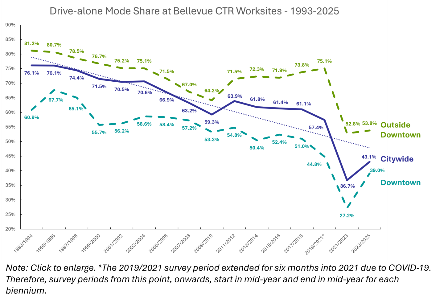 As of November 2025, there are 76 affected worksites in Bellevue with over 45,000 employees, which is nearly one-third of all workers in the city. From 1993 to 2025, Bellevue's CTR-affected employers lowered the rate of people commuting by drive-alone options from approximately 76 percent to 43 percent overall. Downtown CTR employers reduced their drive-alone rate from 61 percent to 39 percent, and employers outside downtown reduced their drive-alone rate from 81 percent to 54 percent.