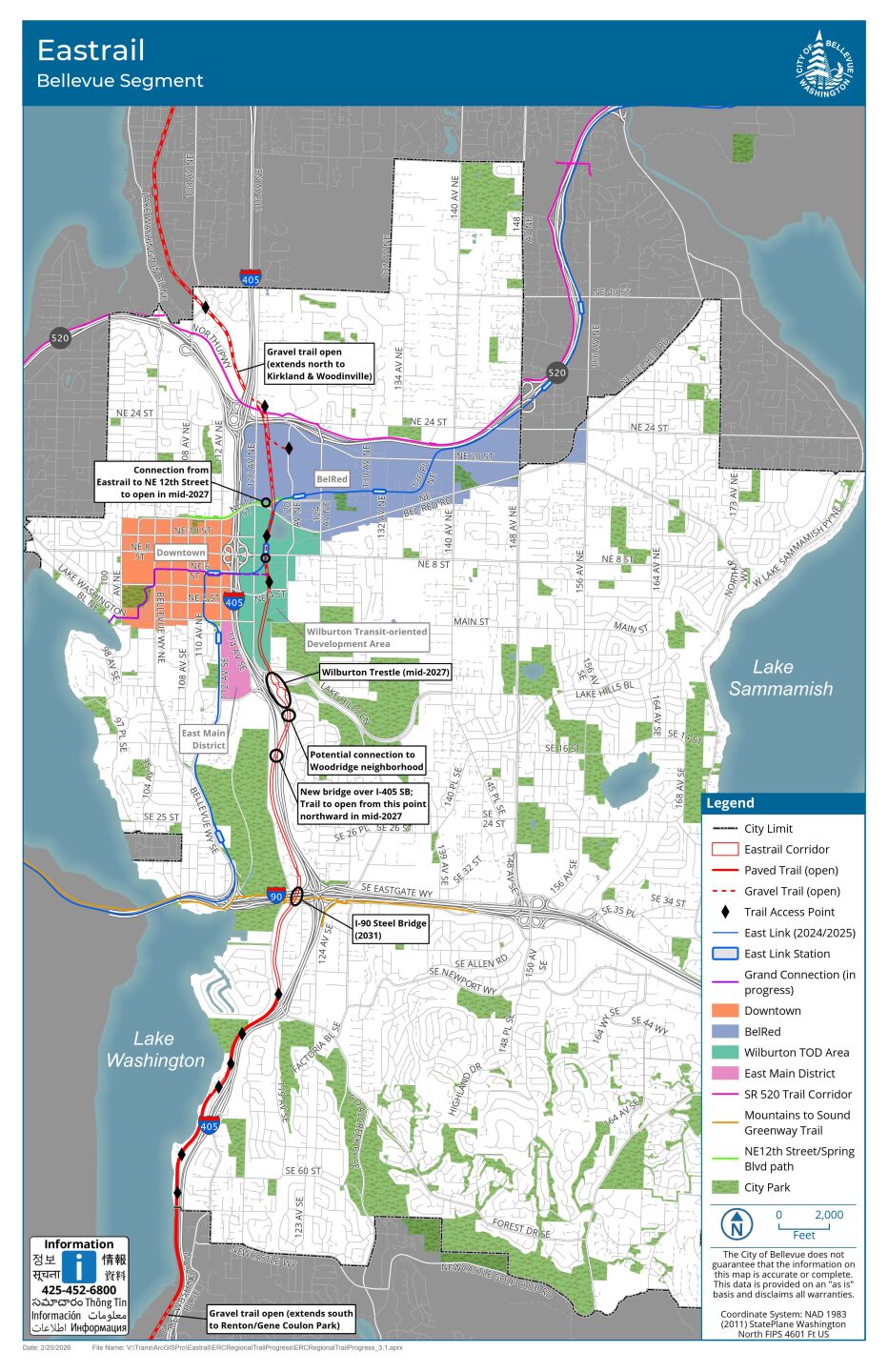 In 2026, work is expected to start on a city project to connect the Eastrail to NE 12th Street. Once complete in 2027, this connection will provide an efficient way for Eastrail users to access Downtown to the west and the Spring District to the east, via the existing east-west path along the north side of NE 12th Street and Spring Blvd. In 2027, work is expected to start on a city project to connect the Eastrail to the Mountains to Sound/I-90 Trail. The connection will involve pedestrian and bicycle facility improvements along two city streets: SE 32nd Street and 118th Avenue SE.